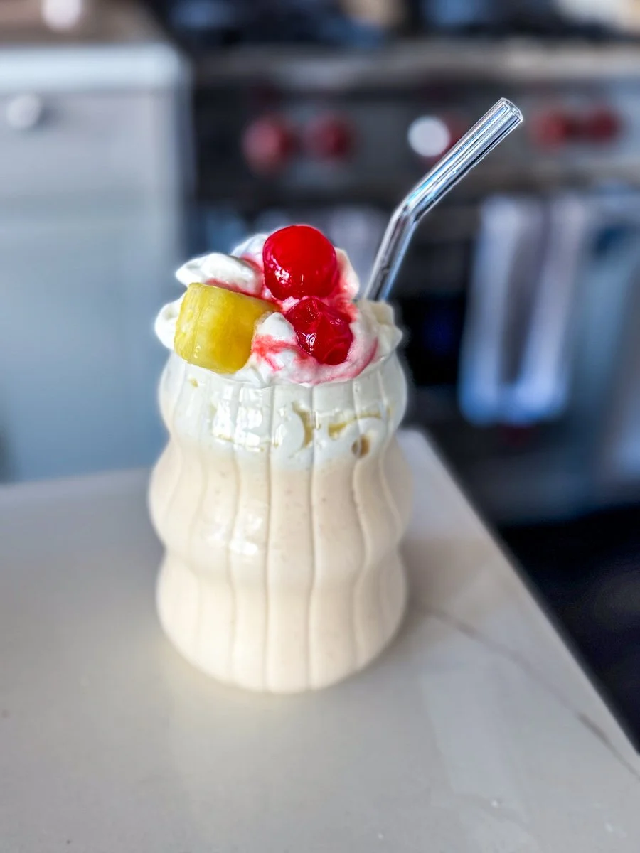 It tastes like dessert: The mix of sweet, creamy pineapple, cake batter extract (or protein!), and a bit of maraschino cherry juice makes this drink taste just like a slice of cake.